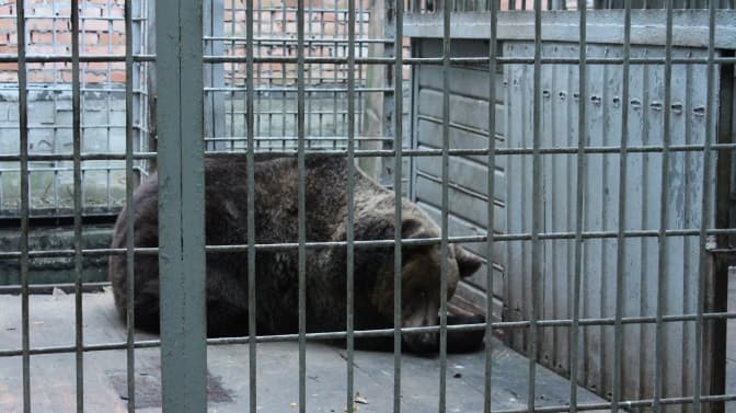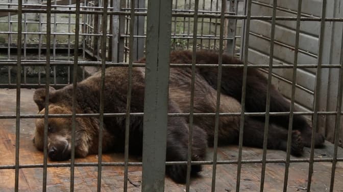 Велика бура ведмедиця з дитинства жила у невеликому вольєрі ресторану. Коли вона була маленька, її маму вбили мисливці, а невідомий чоловік забрав ведмежа до себе. За три місяці випадкові люди побачили її.