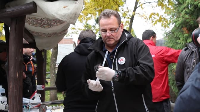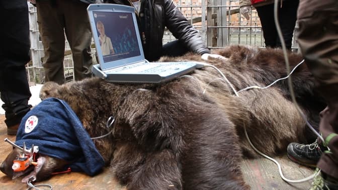 «Тепер обережно!», – командує ветеринар і йде ближче до тварини, щоб перевірити, чи вона заснула. За хвилину він та його помічники вже у вольєрі підключають Машу до потрібних апаратів, щоб точно проконтролювати стан ведмедиці, проводять ультразвукове дослідження. Водночас підключають крапельницю.